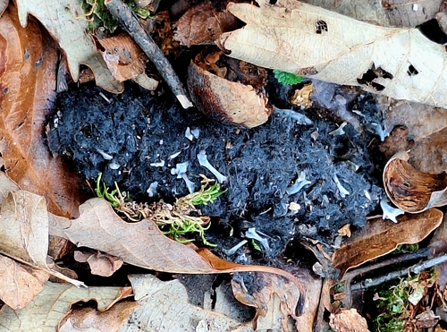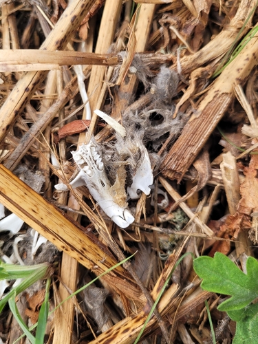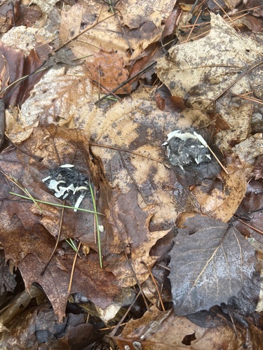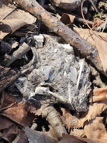 Seems like the remains of an owl pellet. Bones from at least two species present. A winter bone pile Lying near a tree’s bottom Owl pellet, maybeGreat Horned Owl