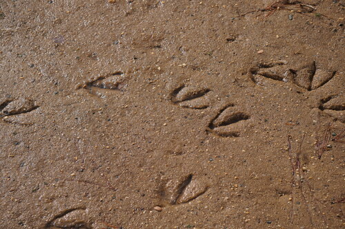 Classic Tracks (also called anisodactyl) have 3 toes pointing forward and one long toe pointing backward. This is common in perching birds, doves, hawks, ravens, herons, egrets, and many others.