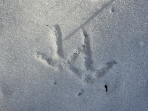 Tracks in the snow at the edge of the ballfields near the Bronx Kill, a location where the resident ravens are often seen foraging and caching food. As pointed out to me by knowledgeable naturalists, proximity of the second and third toes is diagnostic for Corvus. Tracks too large for American or Fish Crows at slightly more than 4 inches in length, measured in comparison to a foot of known size